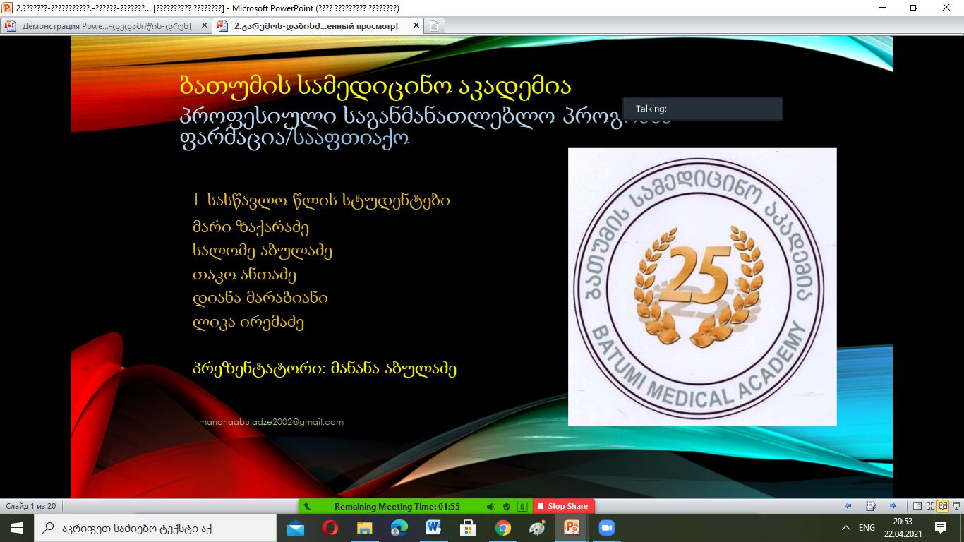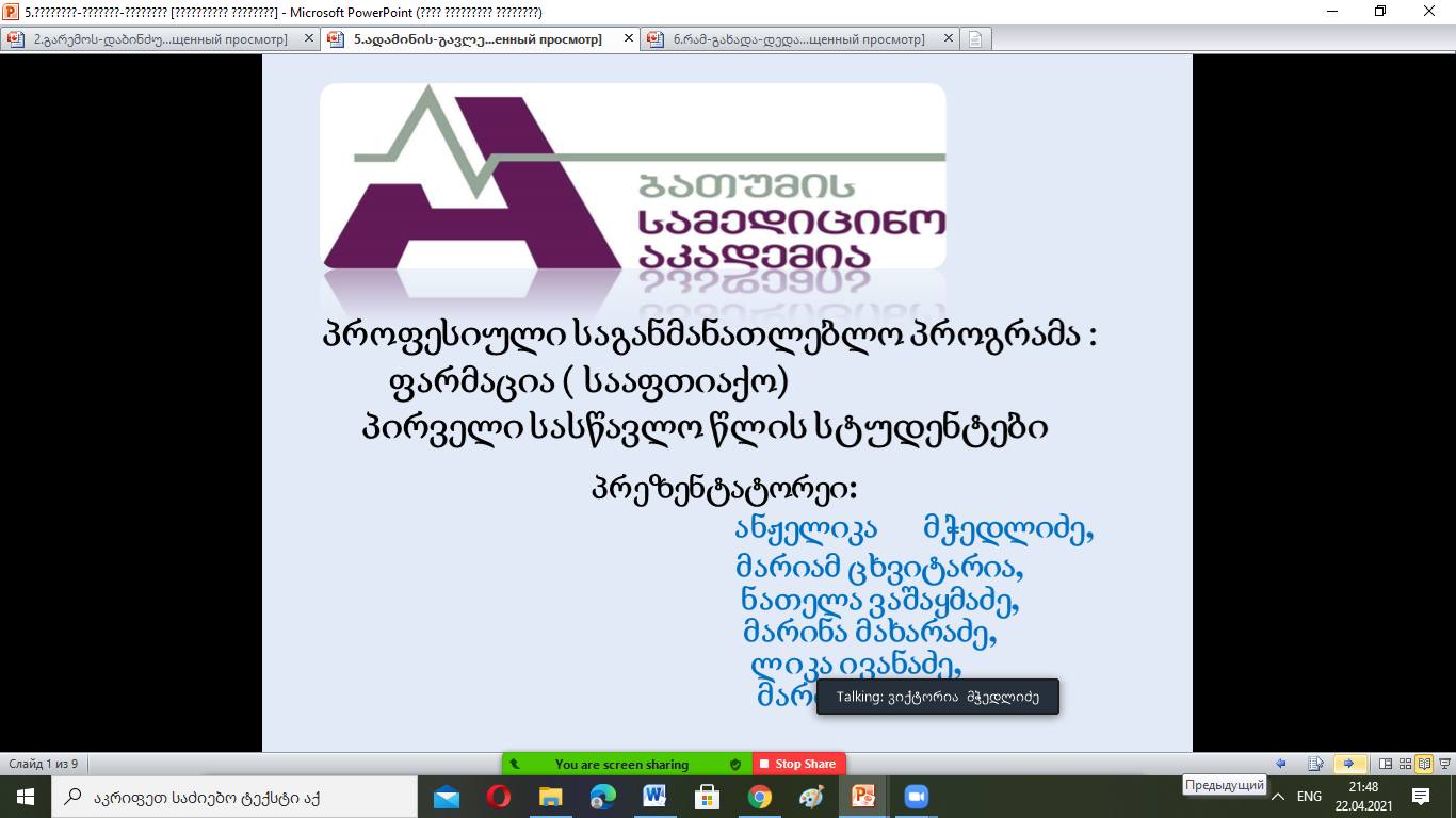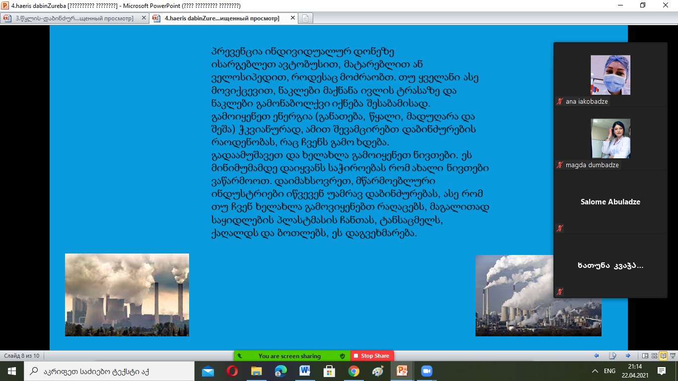 22 აპრილს ბათუმის სამედიცინო აკადემიაში, სტუდენტური გაერთიანების ჩართულობით (სტუდ. გაერთიანების ლიდერი მელანო ხაჩიძე - ფარმაციის (სააფთიაქო) პსპ სტუდენტი, სტუდ გაერთიანების მეცნიერერ - კონსულტანტი სოფიო ბრუნჯაძე, - აკადემიის პგმ, დოქტორანტი). გაიმართა დედამიწის საერთაშორისო დღისადმი მიძღვნილი ონლაინ შეხვედრა - დისპუტი „დედამიწა ავადაა.“ განხილული იქნა თემები: „სად და როგორ აღნიშნავენ დედამიწის დღეს,“ გარემოს დაბუნძურება,“ „წყლის დაბინძურება,“ „ჰაერის დაბინძურება,“ „ტყე შეუნახე შვილებსა,“ „ადამიანის გავლენა გარემოზე,“ „რამ გახადა დედამიწა ავად?“ შეხვედრის დღის წესრიგის საკითხებზე საინტერესოდ ისაუბრეს აკადემიის სტუდენტებმა. გამომსვლელებმა აღნიშნეს, რომ ,,ჩვენი პლანეტა ჩვენი სახლია, მას დიდი გაფრთხილება და მოვლა უნდა.“ სტუდენტებთან ერთად ღონისძიებაში მონაწილეობდნენ აკადემიის პერსონალი, კერძო კოლეჯების წარმოდგენლები.