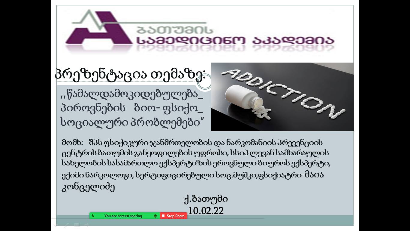 ბათუმის სამედიცინო აკადემიაში რეგულარულად ხორციელდება  სხვადასხვა აქტივობები. 10 თებერვალს ონლაინ ფორმატში  ჩატარდა საჯარო ლექცია  თემაზე „წამალდამოკიდებულება და პიროვნების ბიოფსიქო-სოციალური პრობლემები“. აკადემიის მოწვევით ლექცია წაიკითხა  „ფსიქიკური ჯანმრთელობისა და ნარკომანიის პრევენციის  ცენტრის ბათუმის განყოფილების“ ხელმძღვანელმა, ექიმმა მაია კონცელიძემ. სასწავლებლის  სტუდენტებთან და  პერსონალთან ერთად  ღონისძიებას ესწრებოდნენ: თბილისის №1 სამედიცინო  სასწავლებლის  პროფესიული განათლების  მასწავლებლი გულიკო ცინარიძე, კოლეჯის  „ახალი  ტალღა“ პსპ „საექთნო განათლება“ ხელმძღვანელი  ლელა გოგიტიძე, ქუთაისის საზოგადოებრივ კოლეჯ „სიოს“ დირექტორი სალომე სიორდია. ღონისძიების წამყვანი - მზია ბაკურიძე (აკადემიის ხარისხის უზრუნველყოფის მენეჯერი). შეხვედრის მონაწილეთ მიესალმა და საკითხის აქტუალობაზე  გაამახვილა ყურადღება  აკადემიის  დირექტორმა  რევაზ უზუნაძემ. ექციამ გამოიწვია დიდი ინტერესი. ღონისძიებაში აქტიურად  ჩართული იყვნენ სტუდენტები, სტუმრები, აკადემიის წარმომადგენლები - შორენა უზუნაძე, ქეთევან დიასამიძე, მარინე კვირიკაძე-გურგენიძე... ლექციას ახლდა შეკითხვები, გაიმართა დისპუტი.