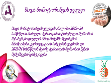 ბათუმისსამედიცინოაკადემიაში გაიმართა აკადემიის შიდა მონიტორინგის ჯგუფის მორიგი სამუშაო შეხვედრა. შეხვედრის მიზანი იყო შიდა მონიტორინგის ჯგუფის ანალიზი 2023/2024 სასწ/წლის პირველი პერიოდის ჩატარებული მუშაობის შესახებ ,მოდულურ პროგრამებში შეფასების პრინციპები, ვერიფიკაციის სისტემის გაცნობა და 2023/2024 სასწ/წლის მეორე პერიოდის მუშაობის წესის შემუშავება/დამტკიცება.
